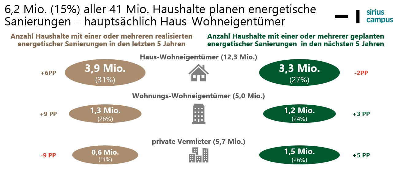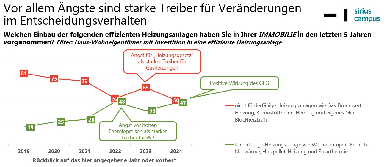 Im Rückblick auf die letzten 5 Jahre haben förderfähige Heizsysteme vor allem im aktuellen Jahr einen deutlichen Schub erfahren. So berichten 47 Prozent der Haus-Wohneigentümer von der Installation einer förderfähigen Heizung, meist einer Wärmepumpe. „Zufriedene Vorbilder in der Nachbarschaft oder im Freundeskreis und die zunehmende Bekanntheit der Förderungen haben vor allem den Wärmepumpen einen Nachfrageschub bereitet“, sagt Dr. Oliver Gaedeke, Geschäftsführer von Sirius Campus. „Die Unsicherheiten über die Fortführung von Förderungen energetischer Heizsysteme werden die kurzfristige Nachfrage nun sicherlich noch steigern.“