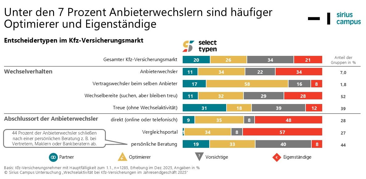 Unter den Wechslern sind überdurchschnittlich häufig Kfz-Versicherungsnehmer im mittleren Alter zwischen 31 und 40 Jahren, Familien mit Kindern im Haushalt sowie selbstbewusst auftretende Optimierer und online-affine Eigenständige. Die zwei anderen Marktsegmente aus der Typologie zum Entscheidungsverhalten – Partner und Vorsichtige – sind wesentlich treuer und damit langfristig attraktivere Kunden für Versicherungsgesellschaften.