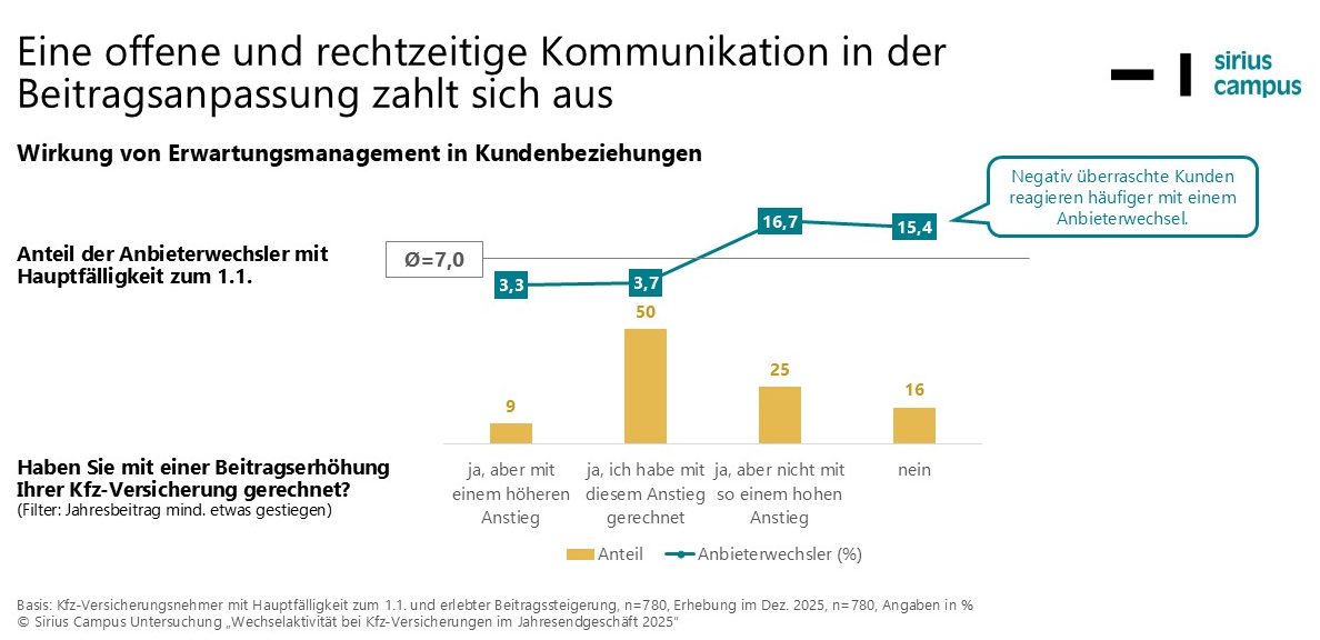 Zwei Fünftel der Kfz-Versicherungsnehmer (42%) haben ihren Jahresbeitragsbrief genau oder sogar intensiv gelesen. Über die Hälfte (61%) haben dabei eine Beitragssteigerung festgestellt, im Jahr 2024 waren dies etwas weniger (58%). „Viele Kunden hatten bereits durch Vorinformationen ihrer Vermittler oder Versicherer mit einem Beitragsanstieg gerechnet, was die Wechselquote halbiert. Durch die Briefgestaltung kann die Wechselaktivität zusätzlich reduziert werden“, kommentiert Dr. Oliver Gaedeke, Gründer und Geschäftsführer der Sirius Campus GmbH.